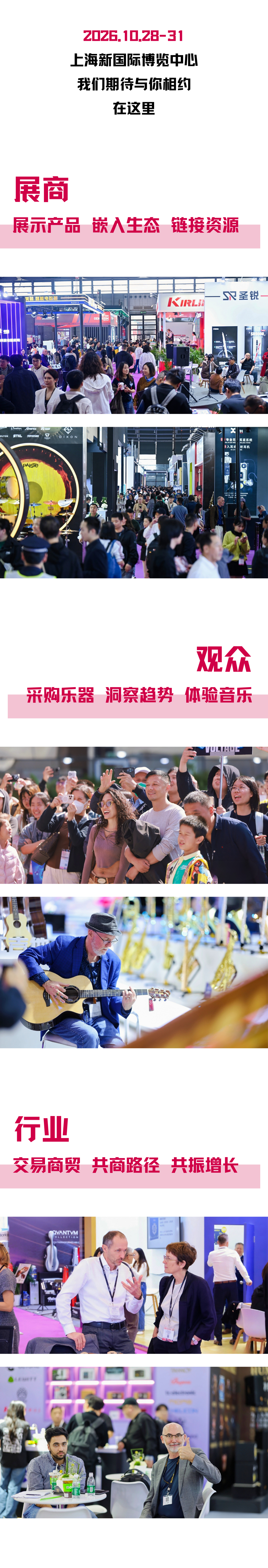 中国(上海)国际乐器展览会自2002年创办,历经二十余年发展,已成为全世界极具影响力的乐器展。参展企业和展示产品基本涵盖行业全貌,从产品设计制造到音乐教学培训,展商和观众都可以获取最新行业资讯、找到商业伙伴。展会坚持走国际化、专业化的发展道路,推动产品技术升级、行业创新发展、产业能级提升,日益成为海外买家采购产品、国内乐器走出国门的平台。